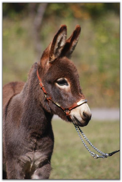 Posey is a little show donkey. She is very heads up and always alert to everything around her. She has the most beautiful ears like her mom, long and curved. Posey is very sweet and people oriented and will stand very quietly while you are petting her. She has beautiful show quality conformation.