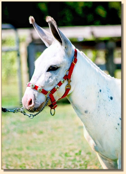 We named this precious girl Little White Lie because although she is now a light red and white spot she will 'frost out' when she is older and be completely white like her mom. But I sure would love to be totally wrong about that. So very sorry but this jennet is Not For Sale. Liza has turned out to be one of the most gorgeous and correct jennets we could ever hope for. We are so very thrilled to add her to our future brood jennet band when her show career is over.