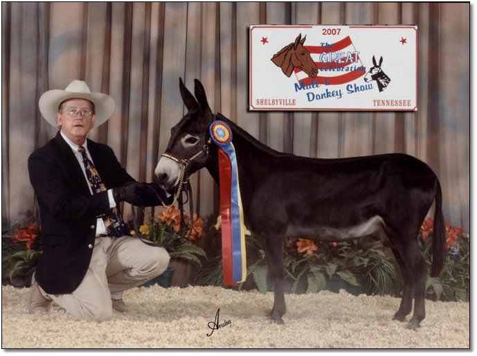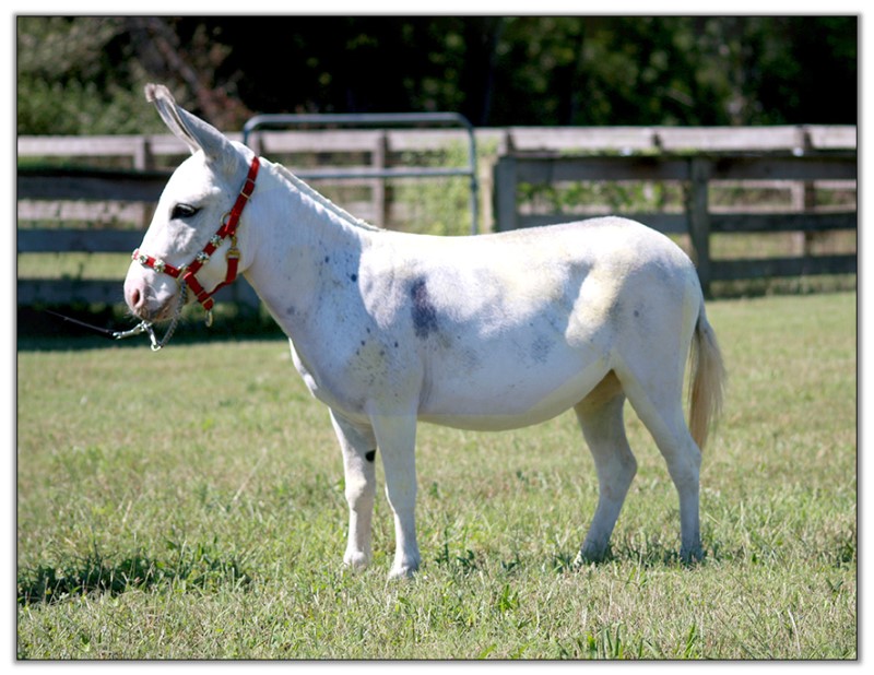 Liza, with very limited showing, only needs five more points to earn her excellence in halter with The American Donkey Association.  We are going to put off breeding her until her show career is over. We left her at home this year because she always placed in front of Jitterbug but now that Jitterbug does not have to prove herself in halter classes any longer we will begin showing Liza again. We are hoping to finish her excellence so we can then retire her to our brood jennet band.