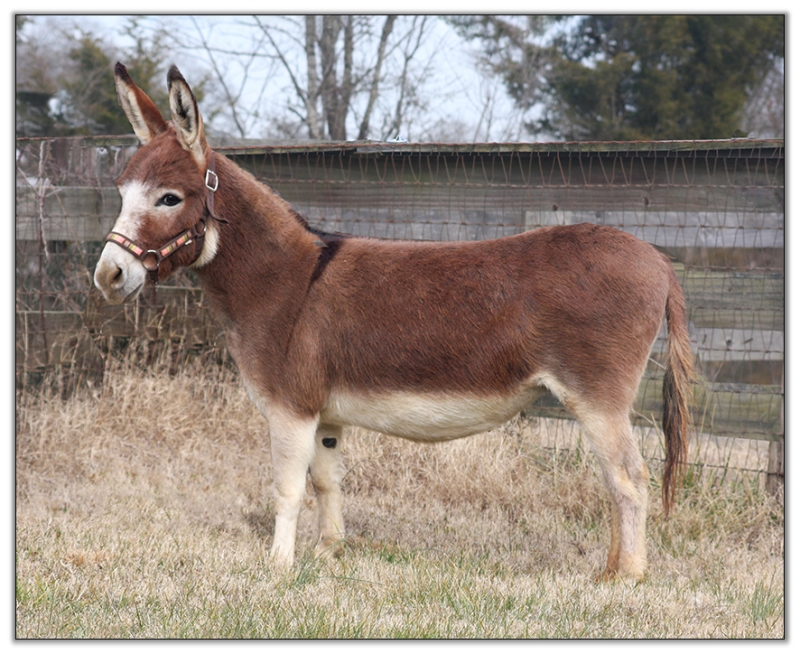 Rosie has been hand bred to Southern Asspitality Miniature Donkey's outstanding dark red jack, Farmstead's Cotton Top Mounts, for a foal due first of April, 2025. Rosie began 'bagging up' on 3/11/25. We expect her to foal in 4 to  6 weeks.