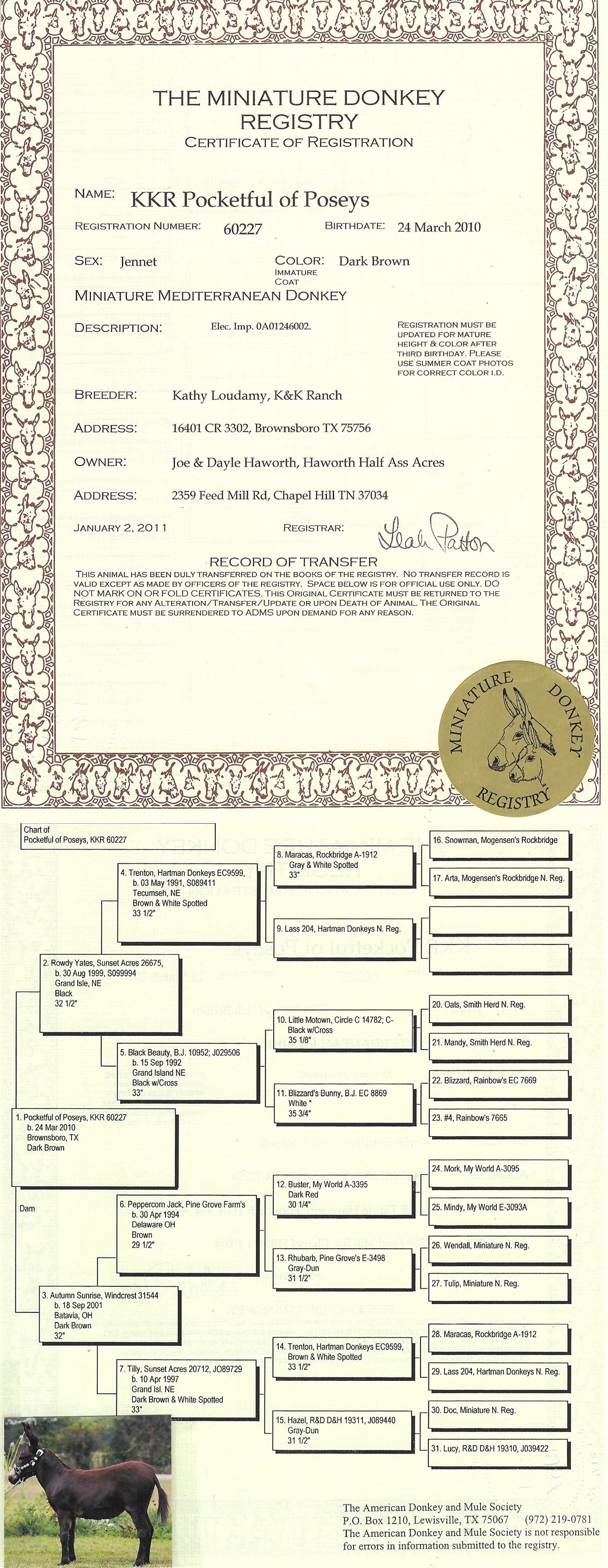Click MDR sign for Miniature Donkey Registry Pedigree Posey's pedigree.
